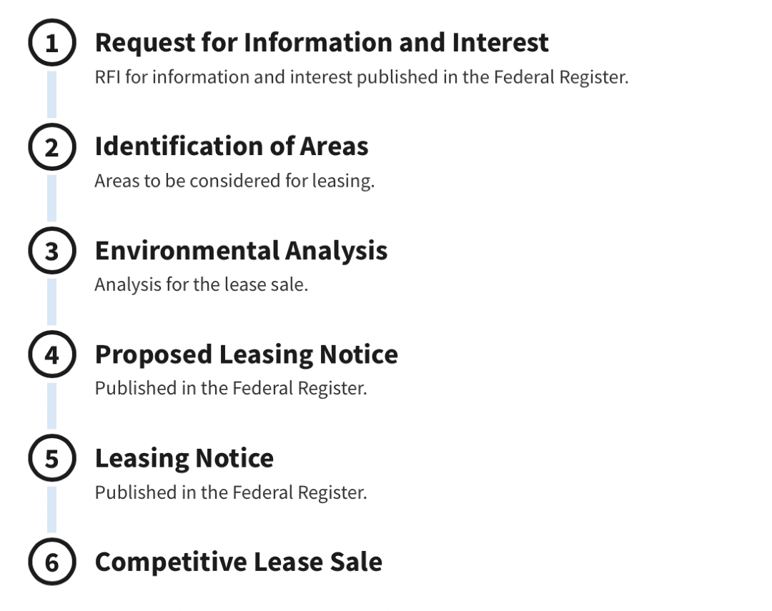 The US Department of Interior (DOI), which will manage the leasing process through its Bureau of Energy Management (BOEM), has announced a formal Request for Information and Interest, known as an RFI.