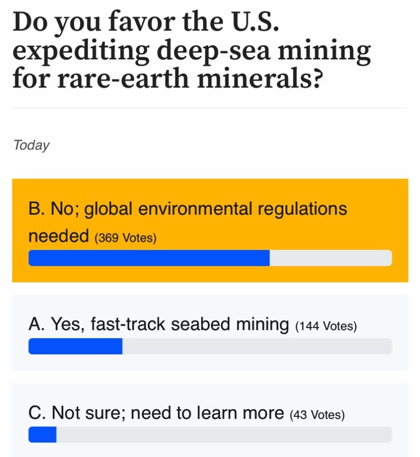 26 percent of respondents agreed with the move to open up deep sea mining, while 7 percent needed more information.