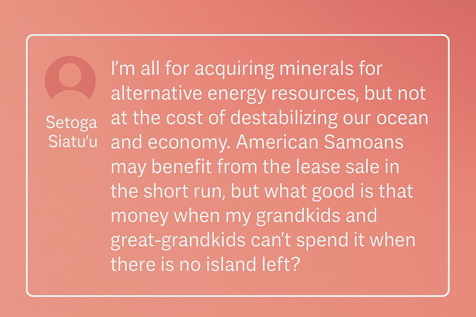 At the same time, two Samoans have already posted comments to the official US government website where the Bureau of Energy Management, BOEM, officially opened its request for feedback yesterday.